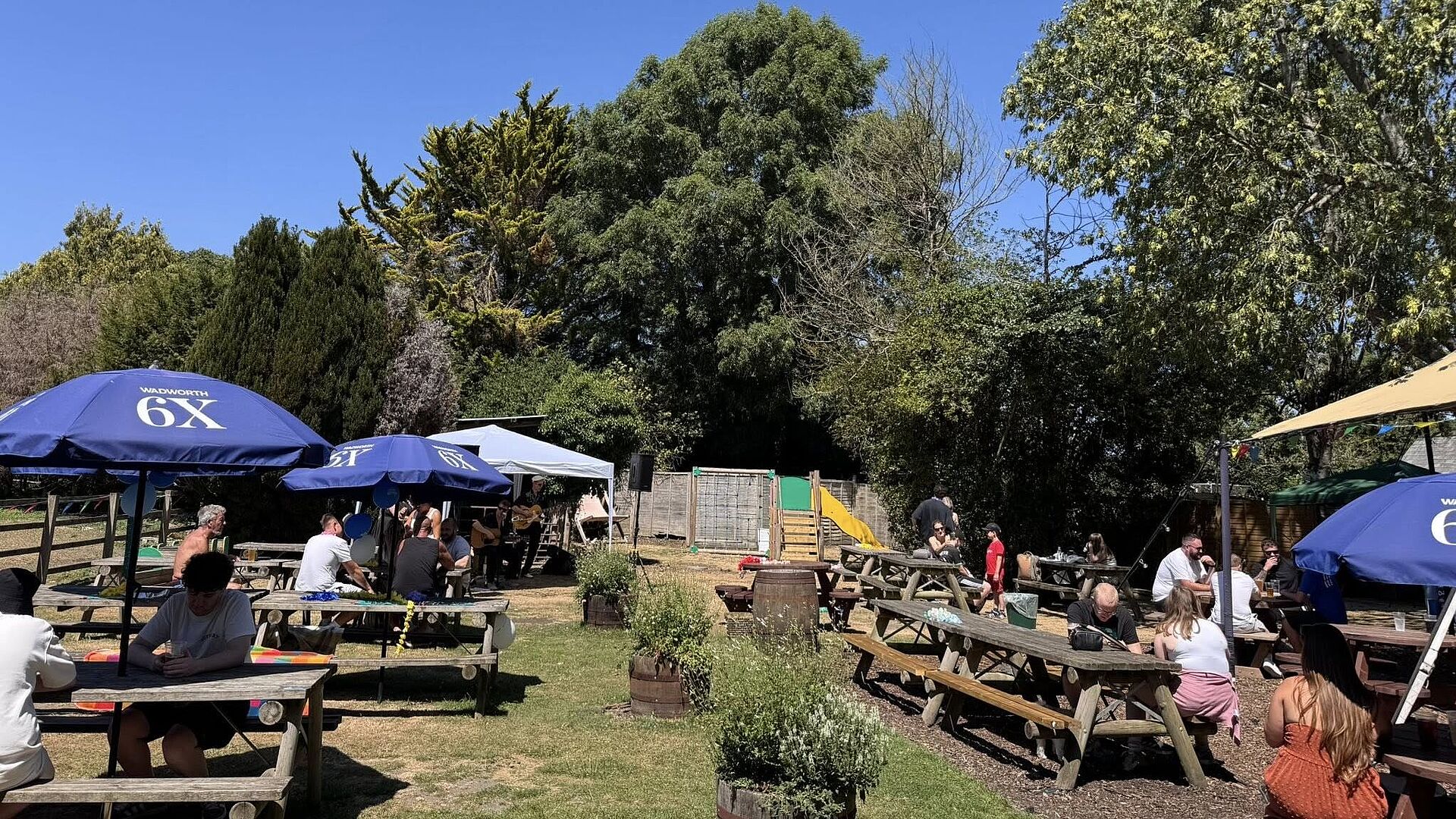 Our large, dog-friendly beer garden offers plenty of seating across a patio and spacious lawn, making it perfect for locals, visitors, and groups of friends. Families are especially welcome, with playground facilities to keep little ones entertained.